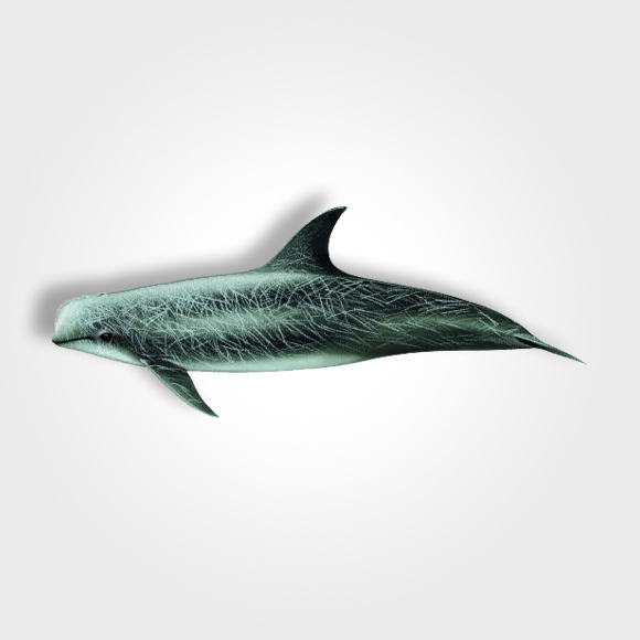 Features: at the birth the livery is grey, but growing up, it is covered by numerous scars which, with increasing age, cover the whole body till when it assumes a white colouration, in particular in the part of the head. The head is bulbous with a V-shaped groove in the centre, and ends with a very small rostrum. It is endowed with 2-7 teeth present only in the lower jaw which serve only to hold the food. The dorsal fin is high and falcate and also recognizable by the presence of scars and scratches, which allow to identify each specimen.